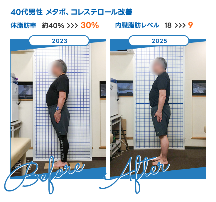 入会当時40%近くあった体脂肪率30%まで減、内臓脂肪レベルも18と高かったのですが、2年で半分の9まで数値を下げることができました!